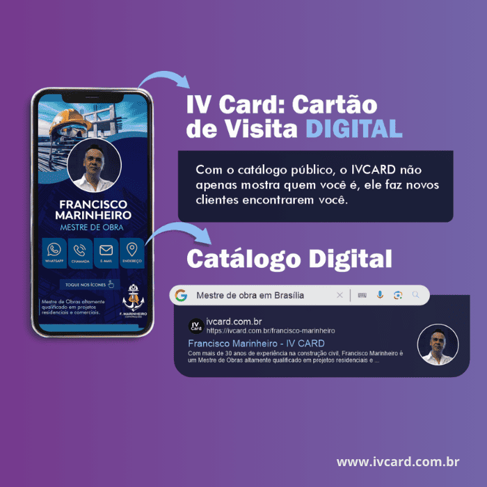 Ao criar seu cartão digital pela plataforma: bio.ivcard.com.br/login, seu catálogo é automaticamente publicado no site ivcard.com.br.
